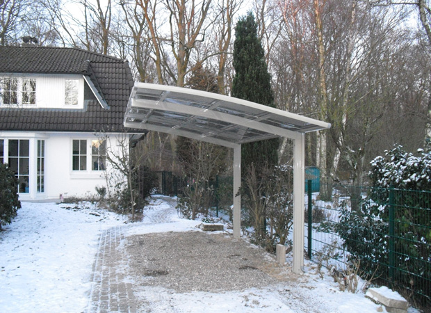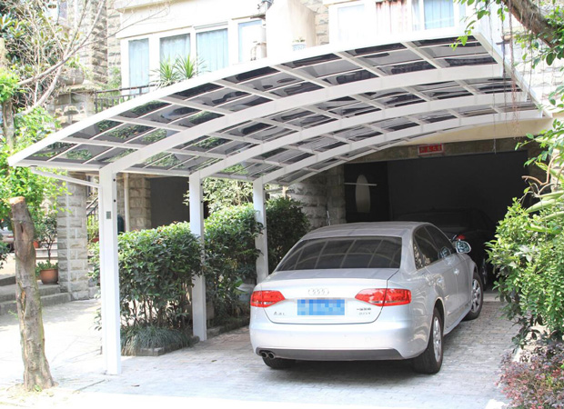 鋁合金停車棚融合歐式浪漫優(yōu)美弧度,簡約時尚的設(shè)計風(fēng)格,帶水槽和排水管