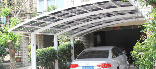鋁合金停車棚頂棚采用進(jìn)口聚碳酸酯板,抗沖擊是玻璃的數(shù)百倍,有效防止高空墜物