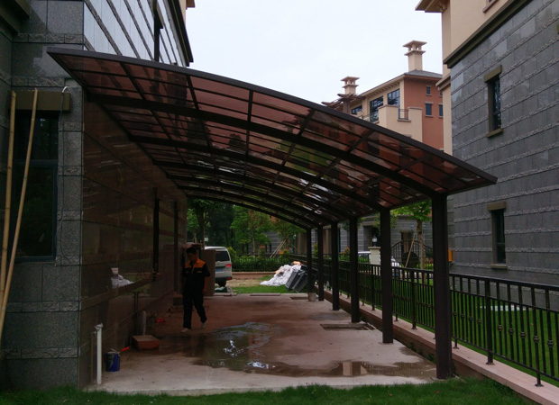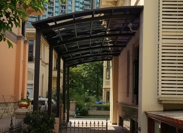 頂棚采用進(jìn)口聚碳酸酯板,抗沖擊是玻璃的數(shù)百倍,有效防止高空墜物